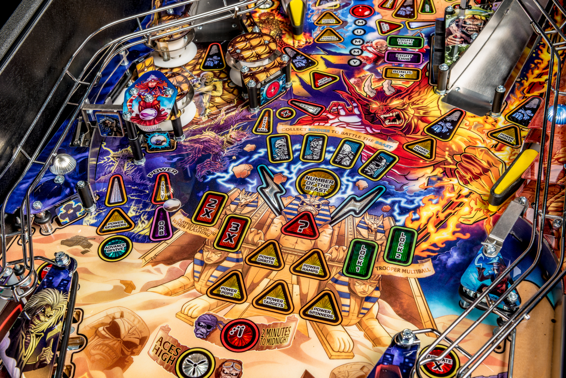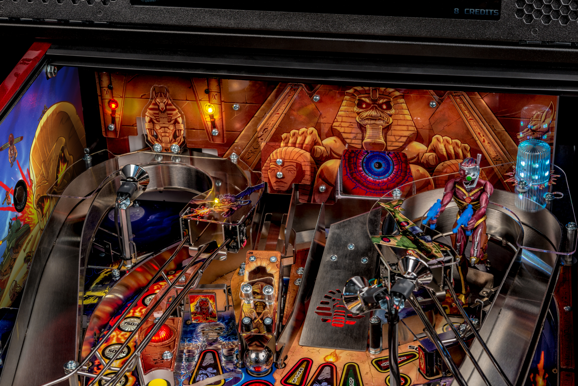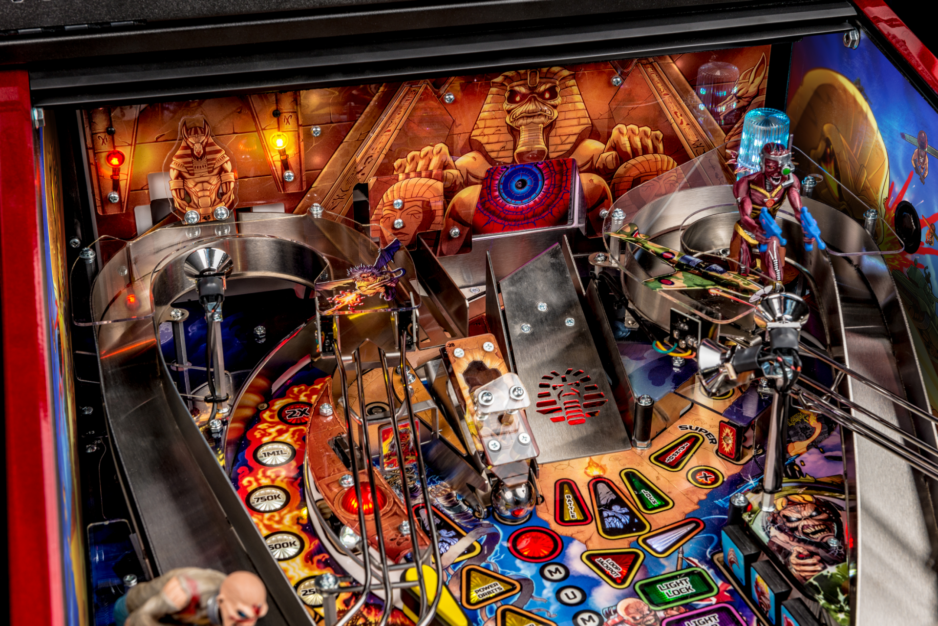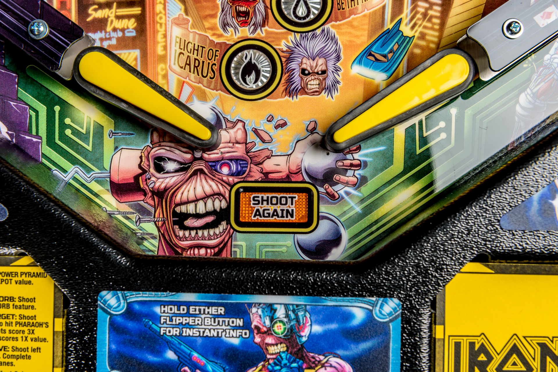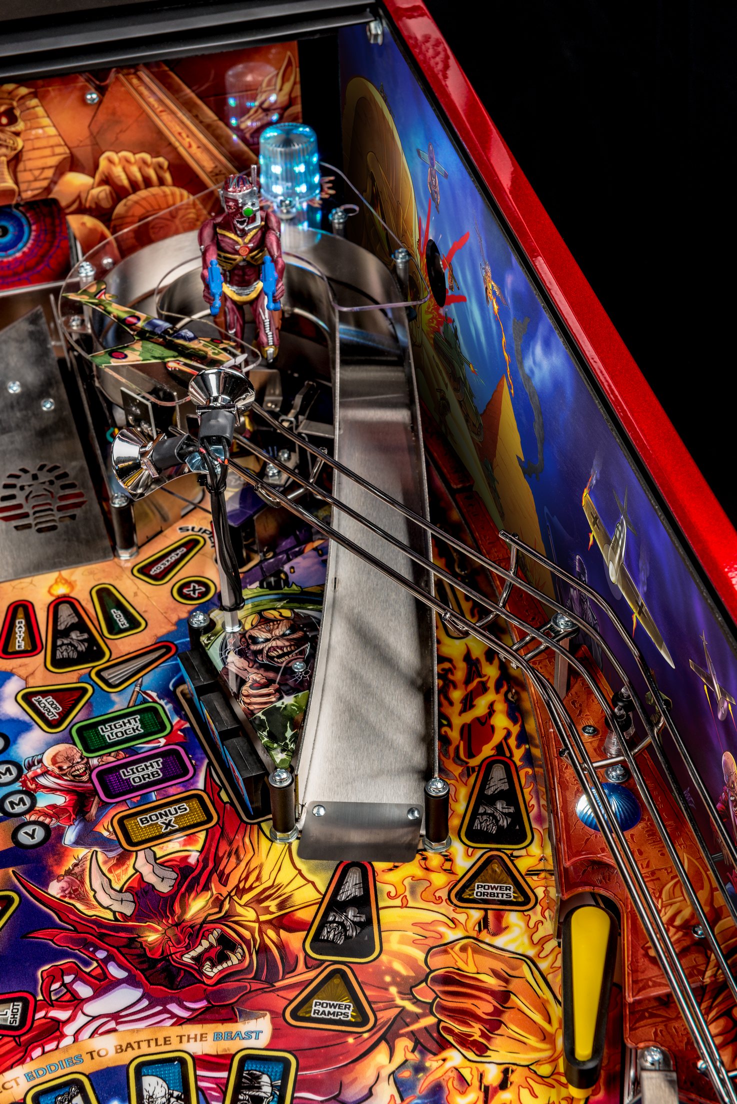Todos los modelos incluyen doce canciones de Iron Maiden con jugadores que irán a la batalla como Eddie con la ayuda de cuatro aletas, dos hilanderos, un conjunto de objetivos de caída de 3 bancos, rampas de metal y forma de alambre, un mecanismo de bola cautiva, un mecanismo de bloqueo de doble poste , y un objetivo central de tiro al blanco.
