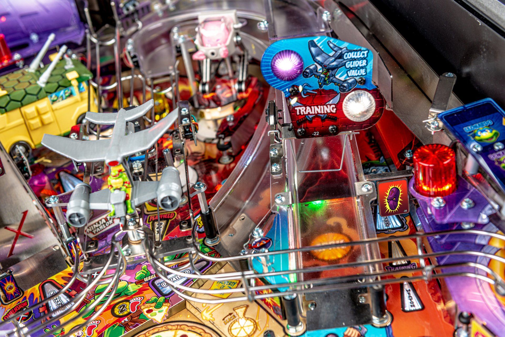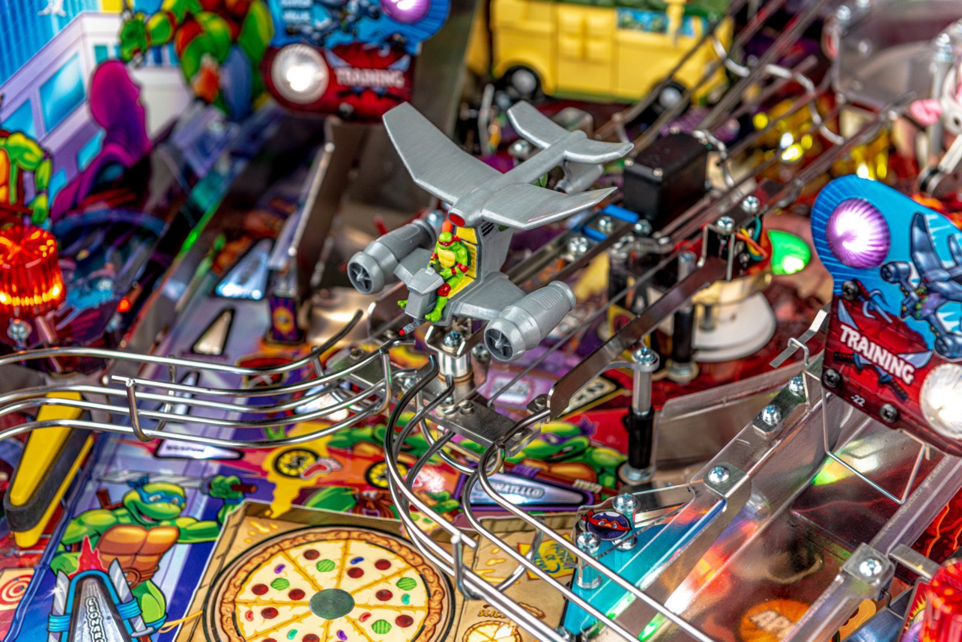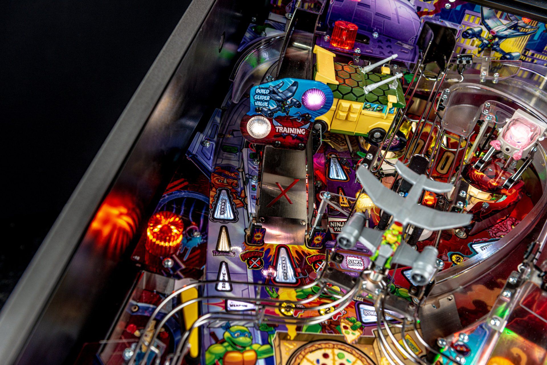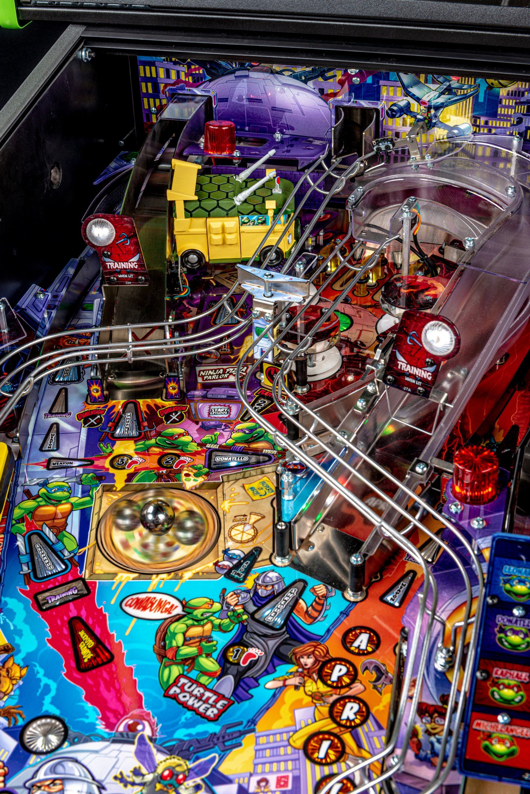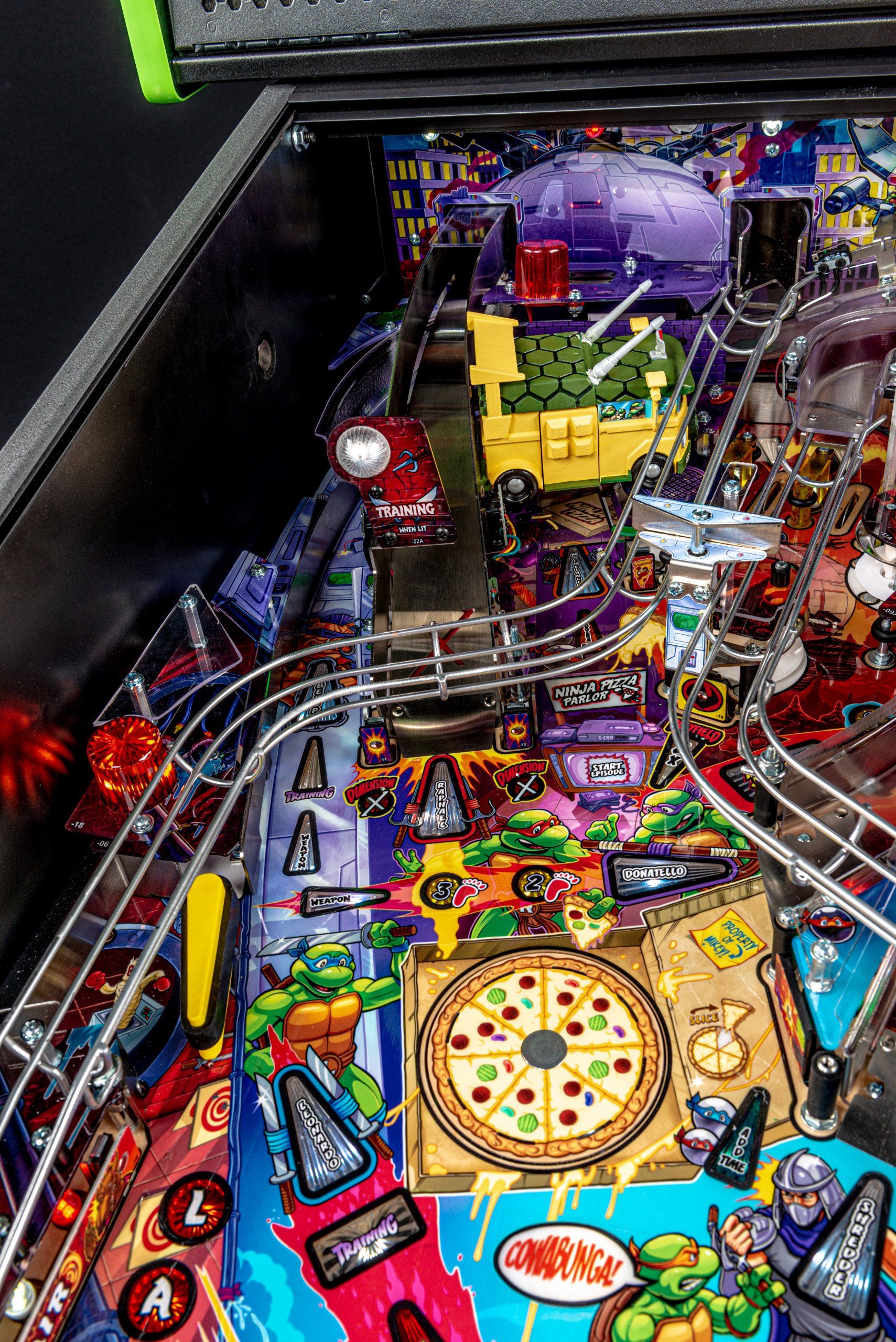 Los modelos Premium y Limited Edition cuentan con una furgoneta Turtles esculpida interactiva personalizada, equipada para bloquear hasta 4 pelotas en el interior con una puerta lateral de apertura / cierre mecánica, lista para desatar estragos multiball sobre los jugadores. Estos modelos también cuentan con el icónico Glider TMNT, un conjunto de desviador personalizado y esculpido controlado por el jugador estacionado sobre ambas rampas, lo que les da a los jugadores la capacidad de controlar y transportar la pelota al flipper de su elección. Además, un juguete Krang mecánico esculpido a medida se cierne sobre los parachoques pop, saltando hacia arriba y hacia abajo mientras se burla de los jugadores durante toda la acción del juego.