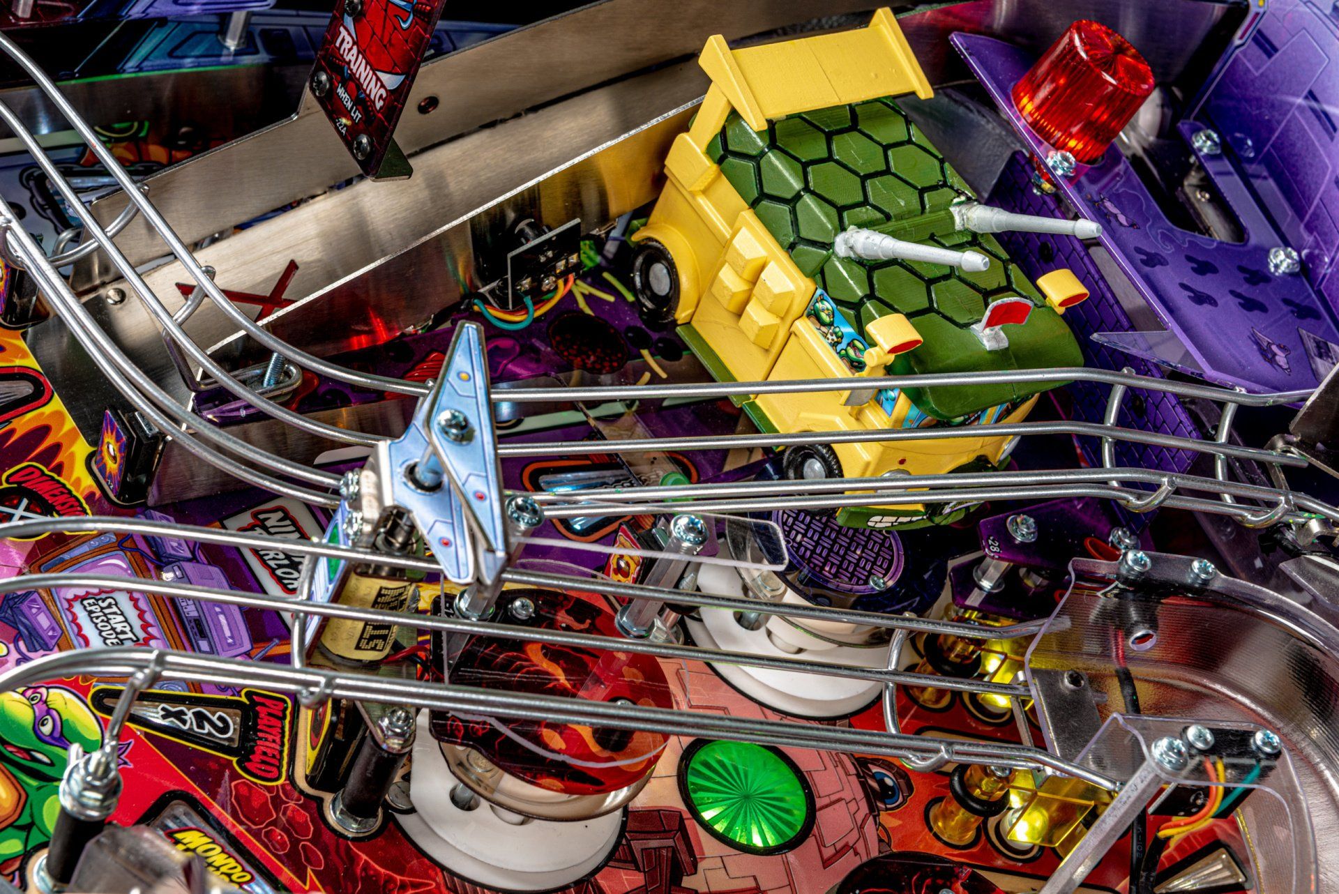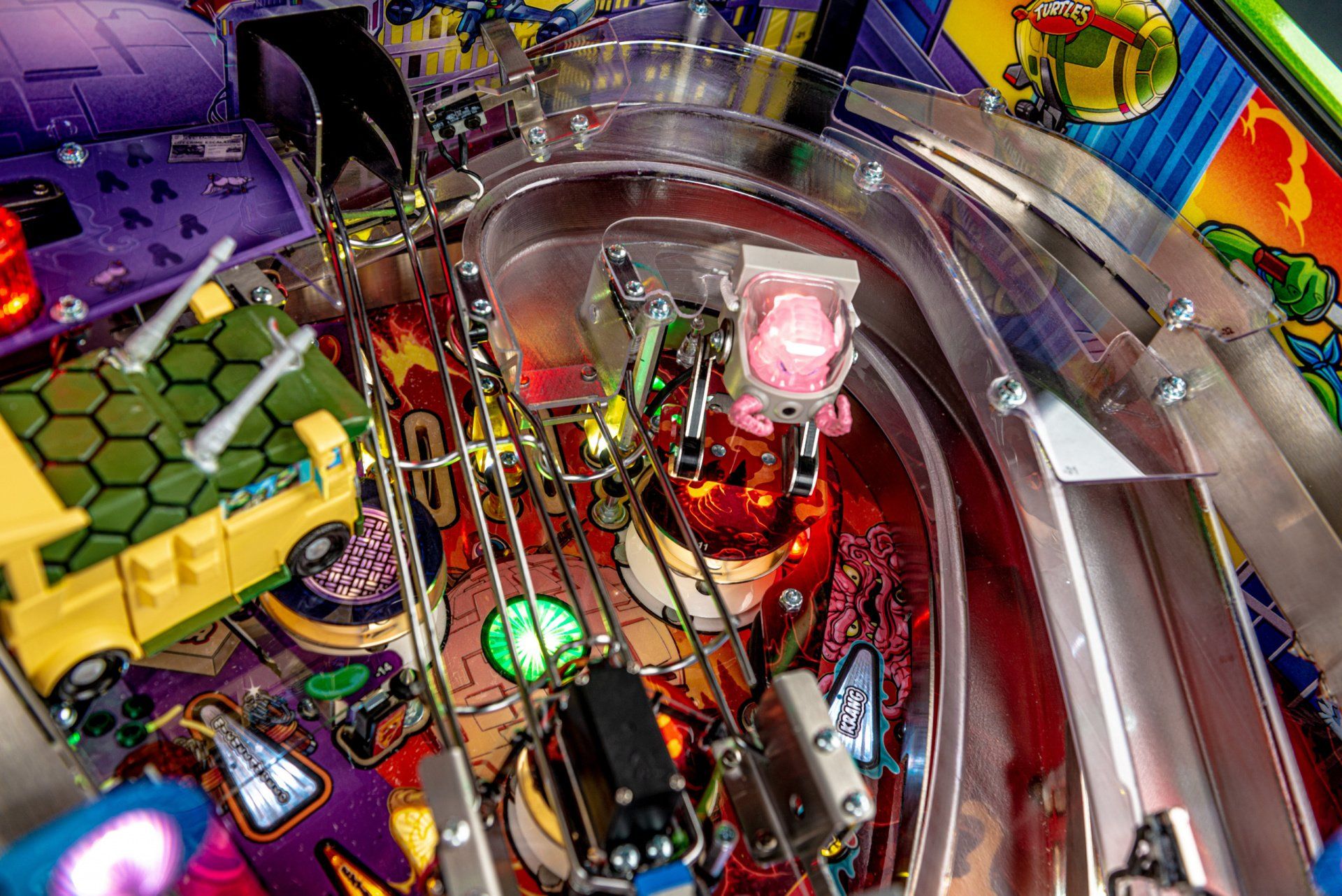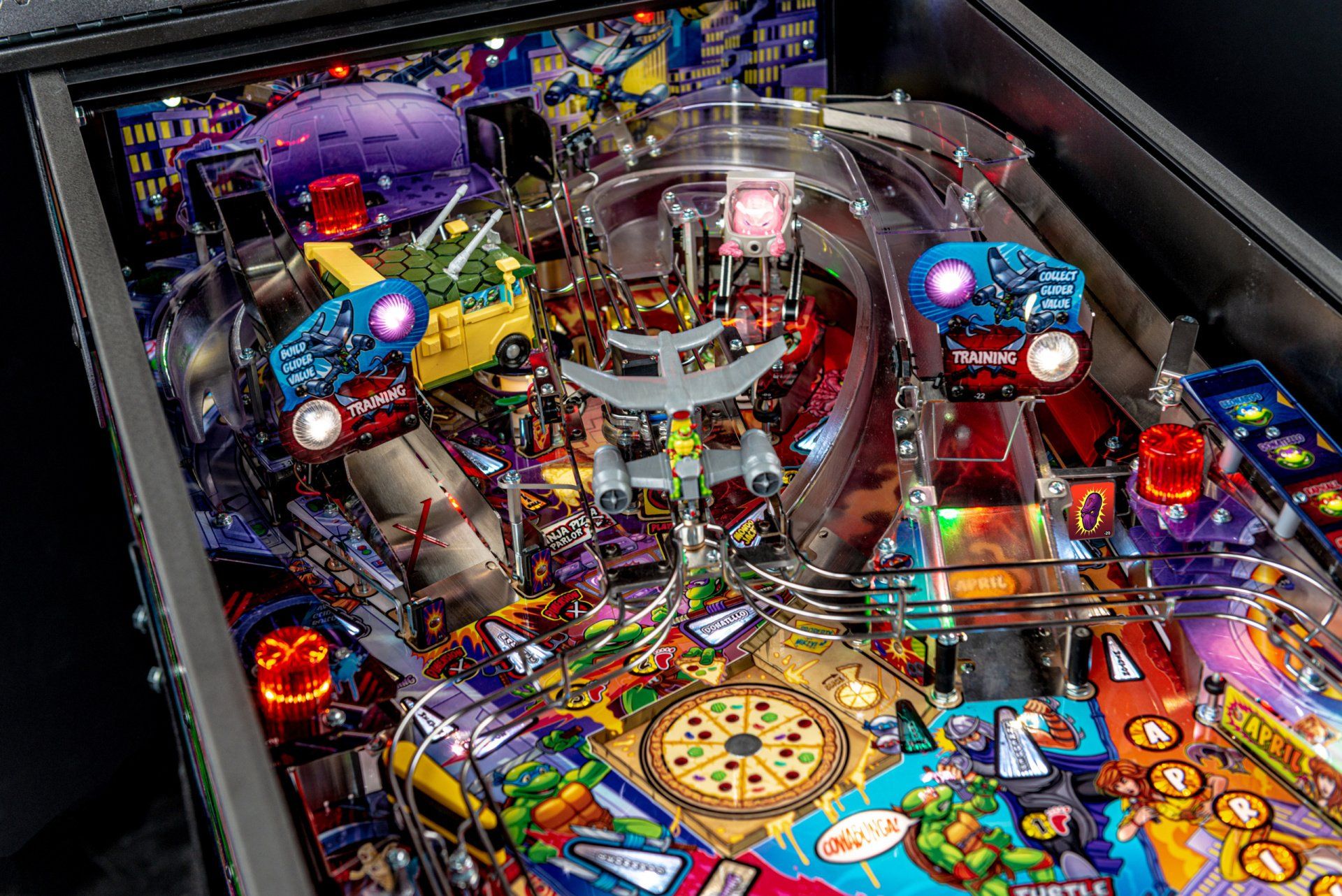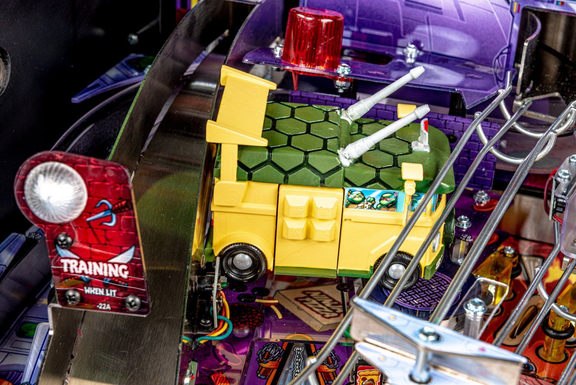 Los modelos Premium y Limited Edition cuentan con una furgoneta Turtles esculpida interactiva personalizada, equipada para bloquear hasta 4 pelotas en el interior con una puerta lateral de apertura / cierre mecánica, lista para desatar estragos multiball sobre los jugadores. Estos modelos también cuentan con el icónico Glider TMNT, un conjunto de desviador personalizado y esculpido controlado por el jugador estacionado sobre ambas rampas, lo que les da a los jugadores la capacidad de controlar y transportar la pelota al flipper de su elección. Además, un juguete Krang mecánico esculpido a medida se cierne sobre los parachoques pop, saltando hacia arriba y hacia abajo mientras se burla de los jugadores durante toda la acción del juego.
