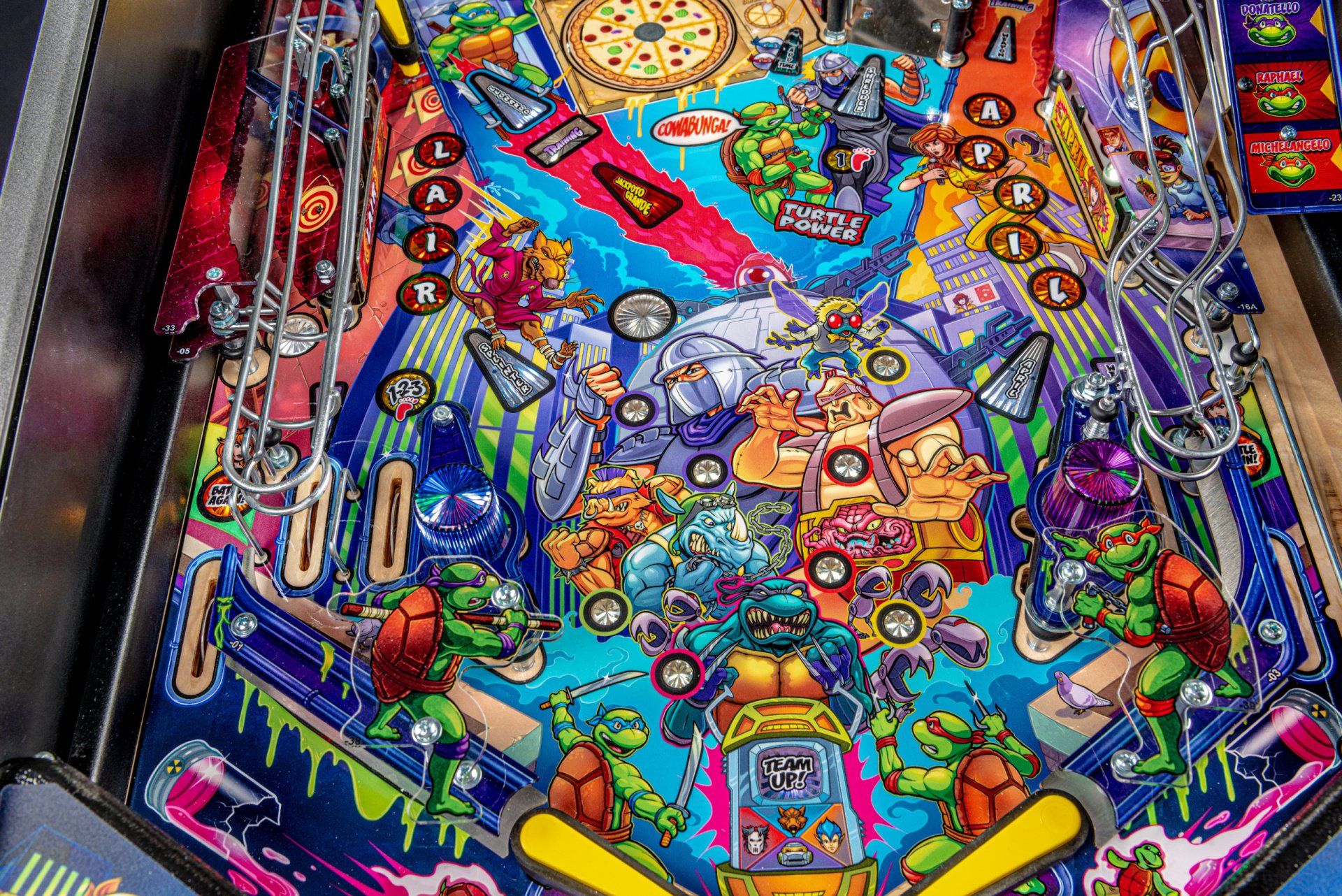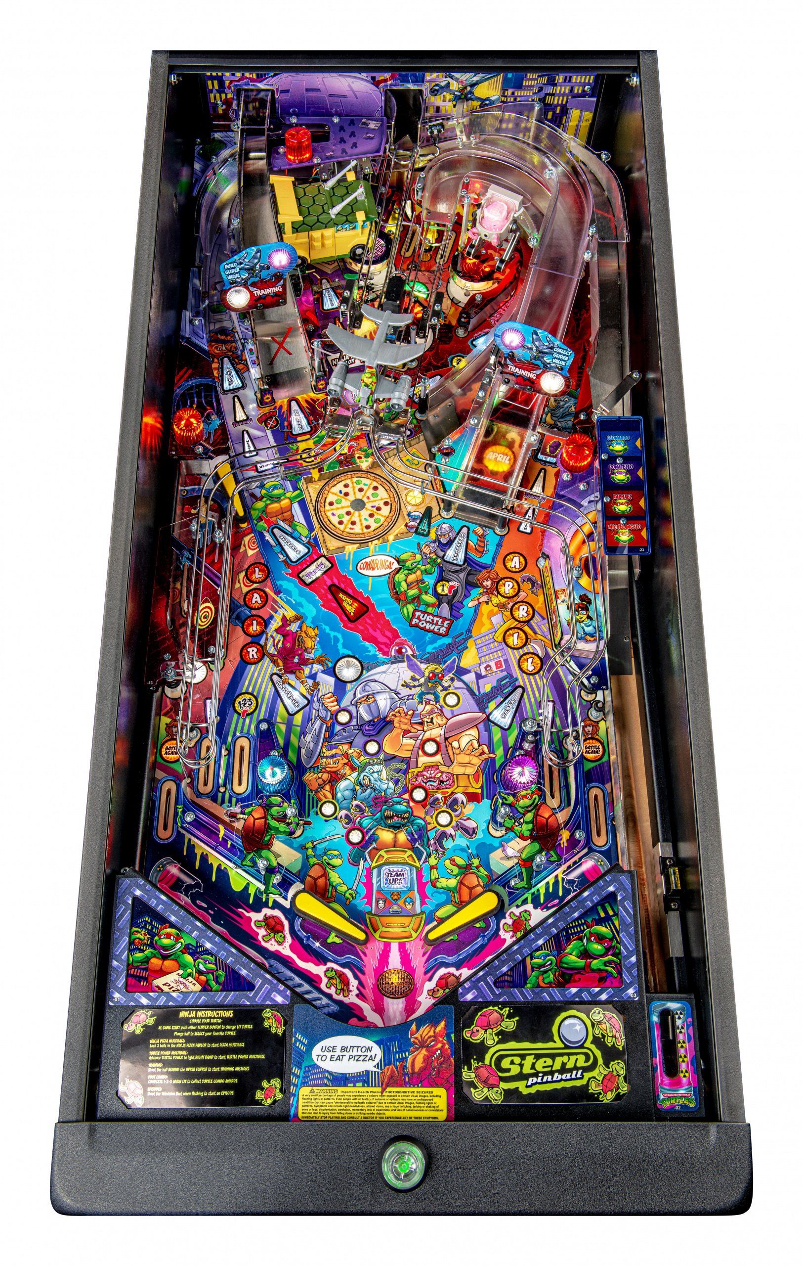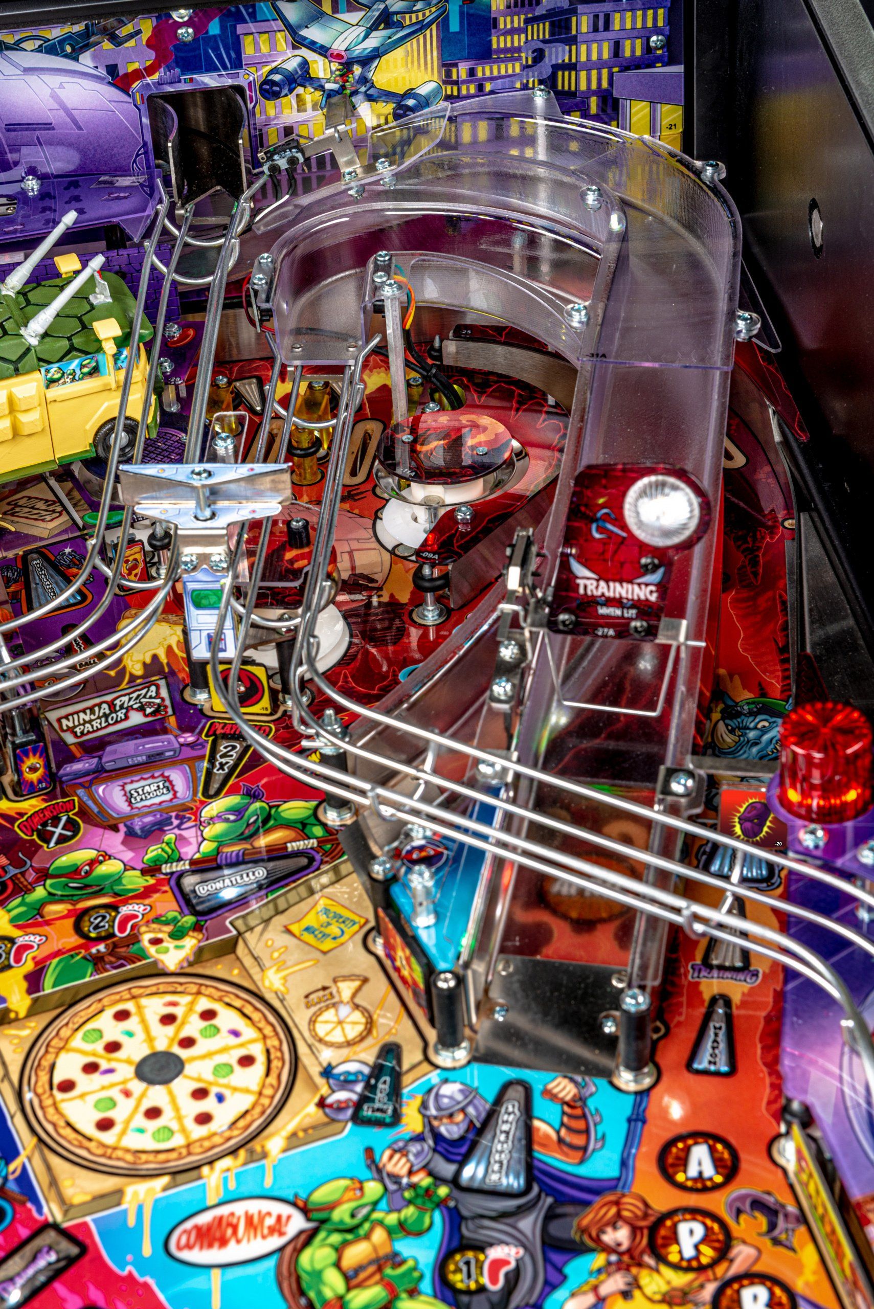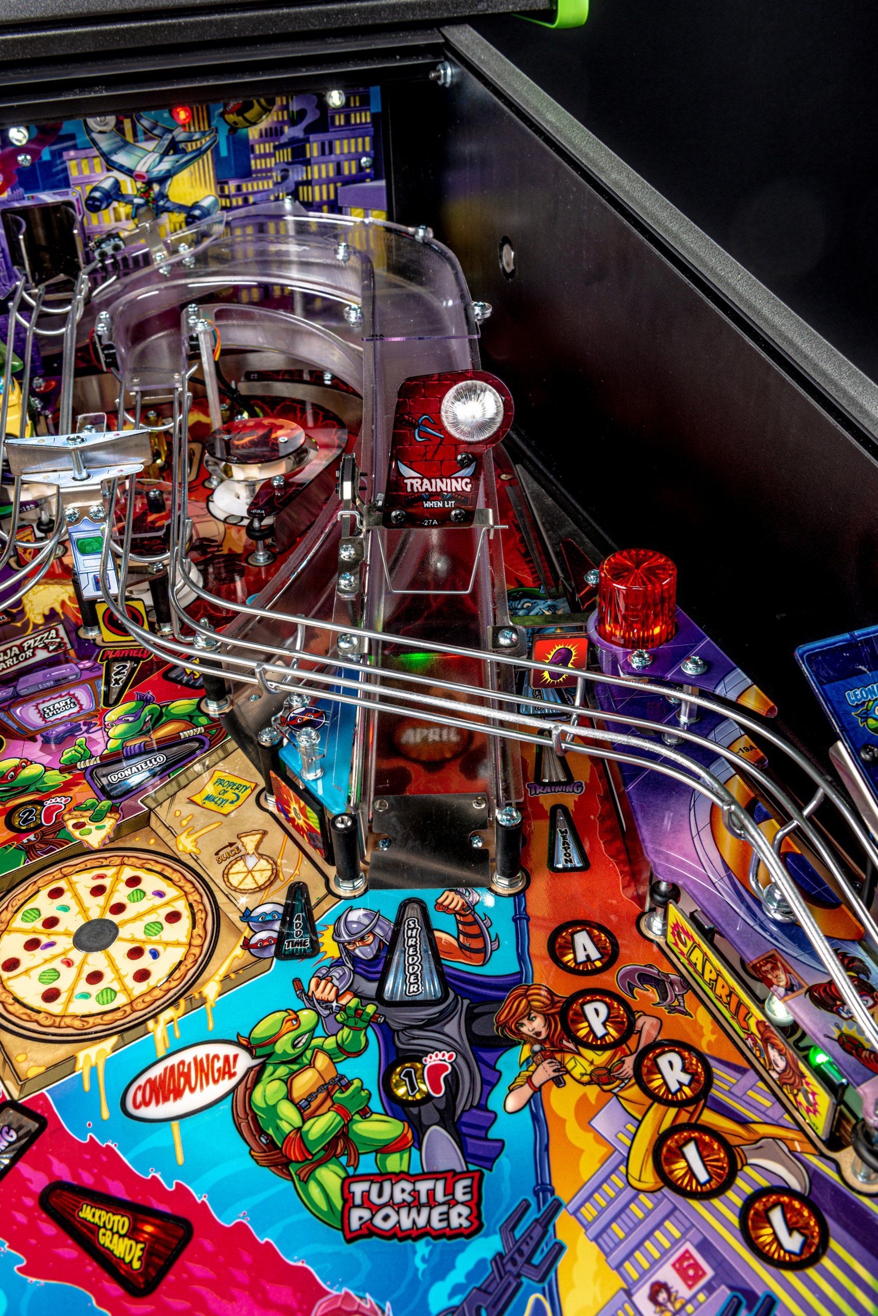 Los modelos Pro, Premium y Limited Edition cuentan con arte distintivo dibujado a mano, además de un disco de pizza giratorio magnético de alta velocidad capaz de sostener y lanzar 3 bolas durante el caos de multiball de pizza. El tema musical original de 1987 complementa la acción con escenas de video personalizadas y eventos creados exclusivamente para esta experiencia de pinball. Todos los modelos incluyen 3 aletas, 3 rampas de alta velocidad y un área oculta de bloqueo de pelota de entrenamiento ninja.