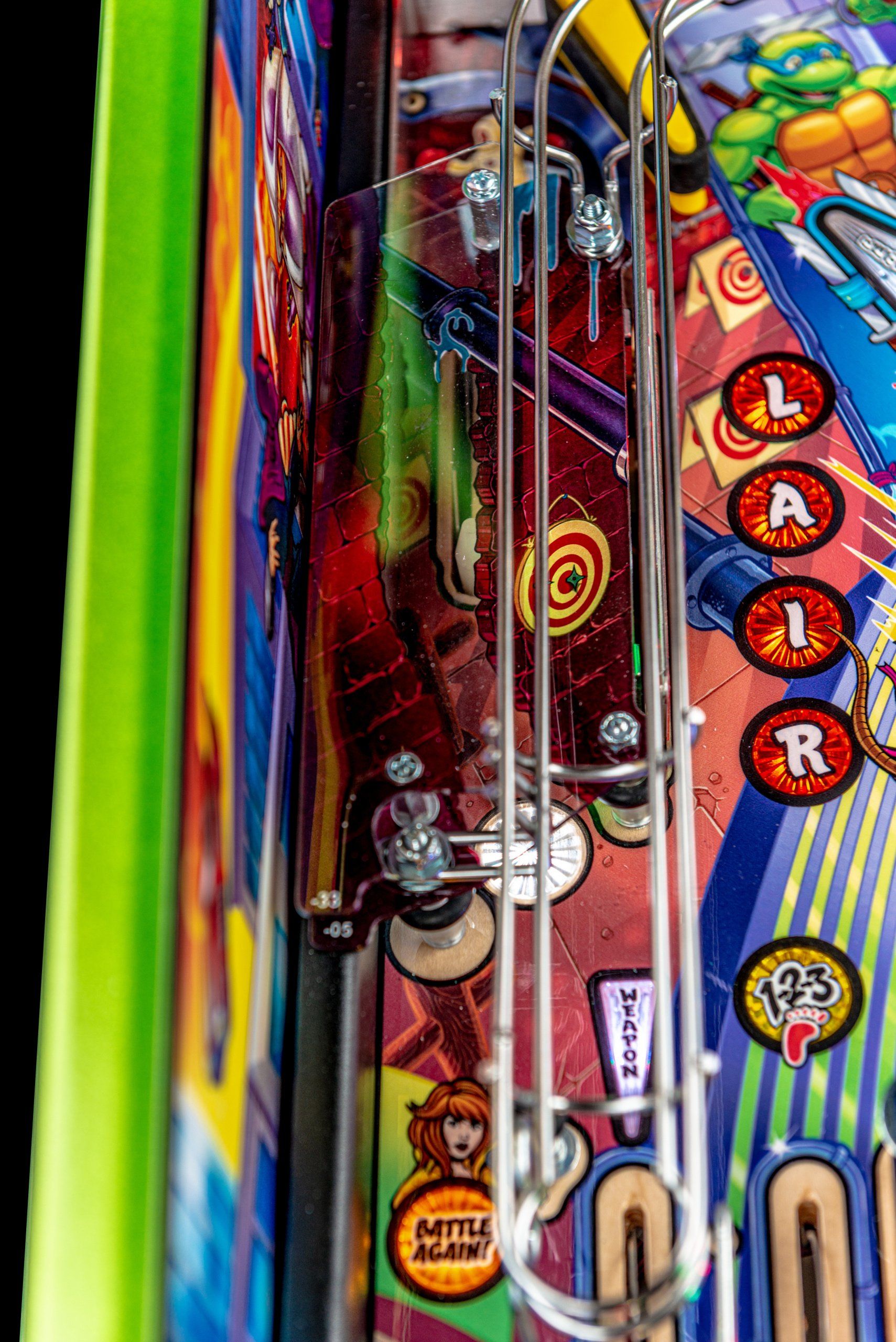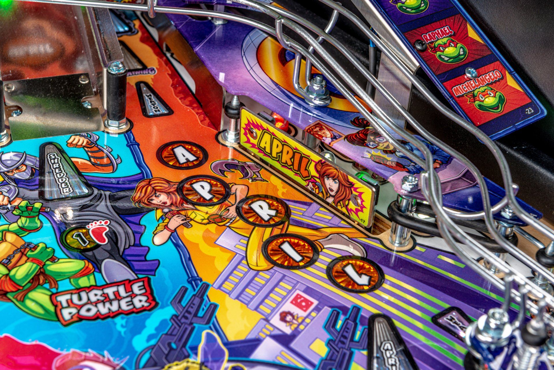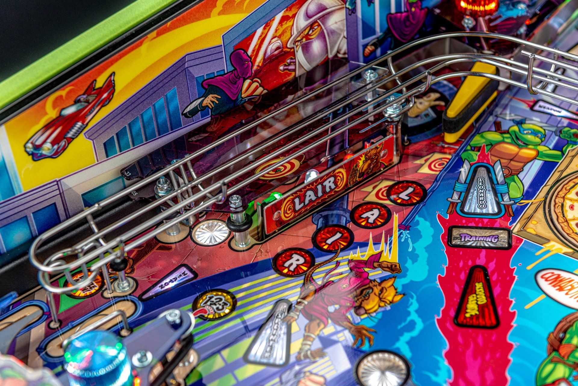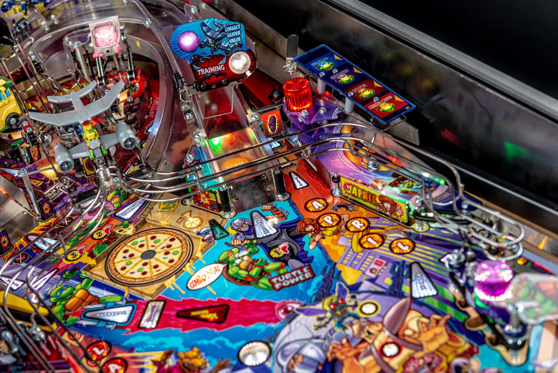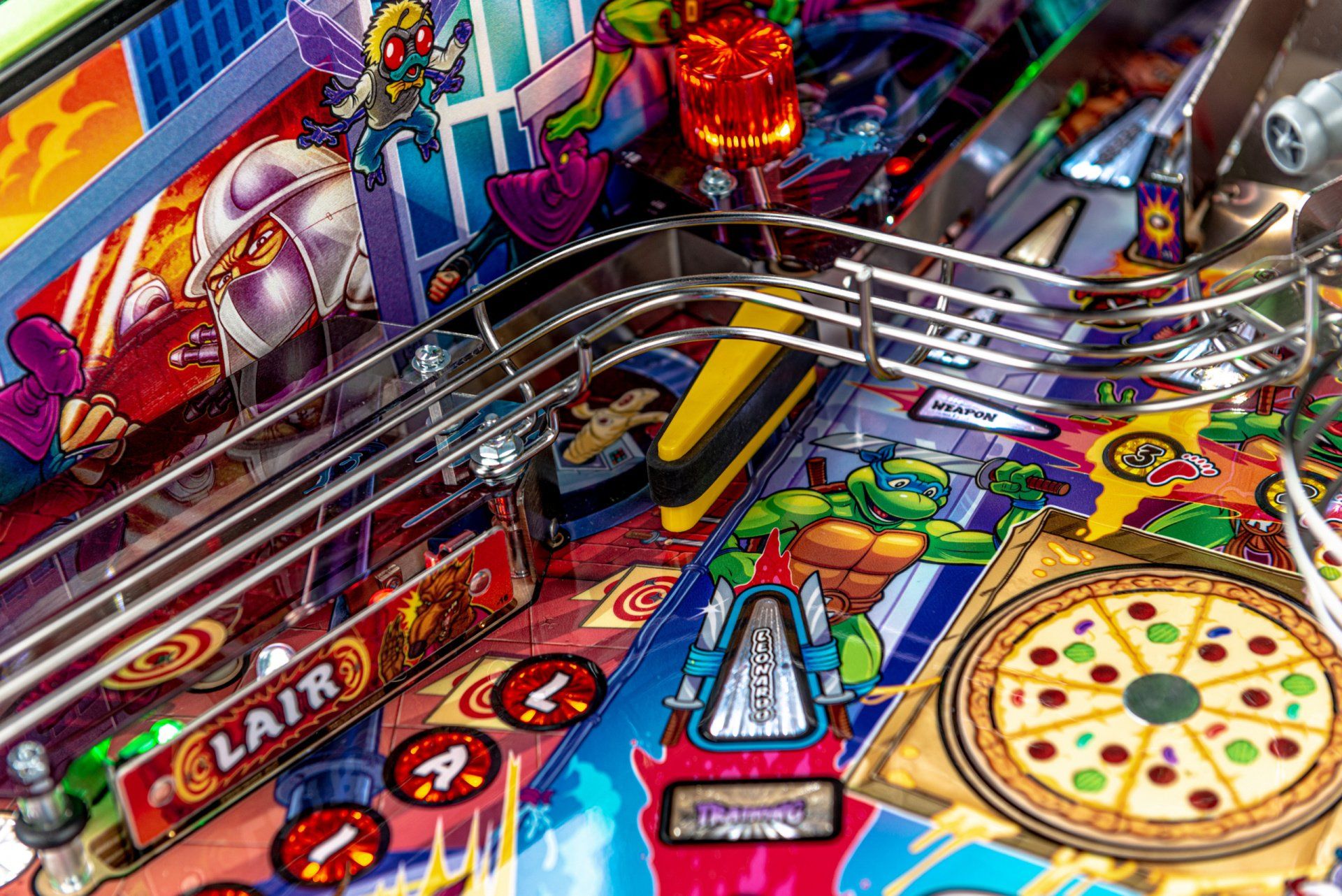 Los modelos Pro, Premium y Limited Edition cuentan con arte distintivo dibujado a mano, además de un disco de pizza giratorio magnético de alta velocidad capaz de sostener y lanzar 3 bolas durante el caos de multiball de pizza. El tema musical original de 1987 complementa la acción con escenas de video personalizadas y eventos creados exclusivamente para esta experiencia de pinball. Todos los modelos incluyen 3 aletas, 3 rampas de alta velocidad y un área oculta de bloqueo de pelota de entrenamiento ninja.